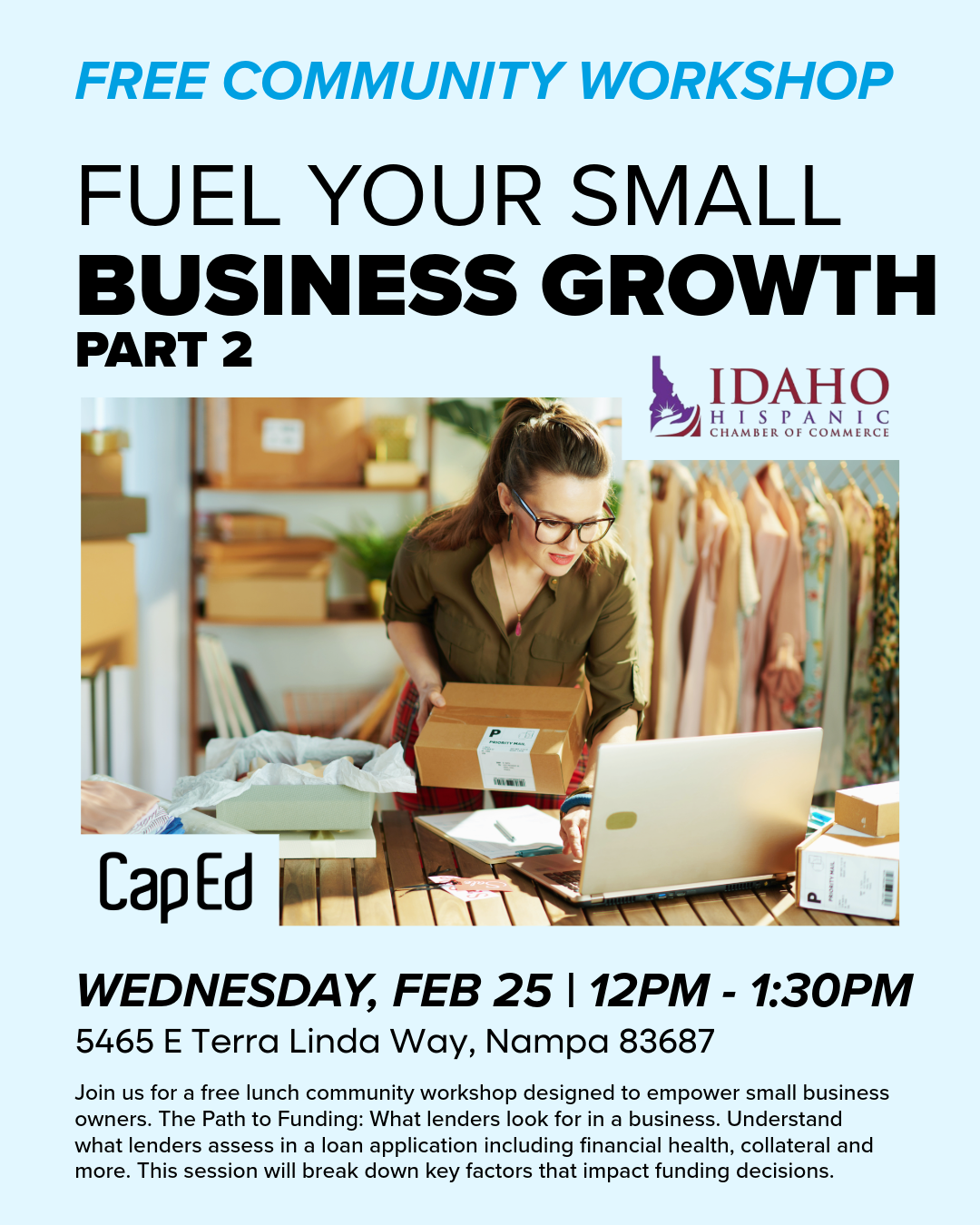 | 2/10/2026 | Idaho Hispanic Chamber of Commerce loves combining networking with valuable resources for your business ventures. Come have coffee, pan dulcé, and make some new connections! This is free to you thanks to our friends at ICHA. A la Cámara de Comercio Hispana de Idaho le encanta combinar la creacion de redes con recursos valiosos para sus negocios. ¡Ven a tomar café, comer pan dulce y haz algunas conexiones nuevas! Todo posible gracias a nuestros amigos de ICHA. more info... |