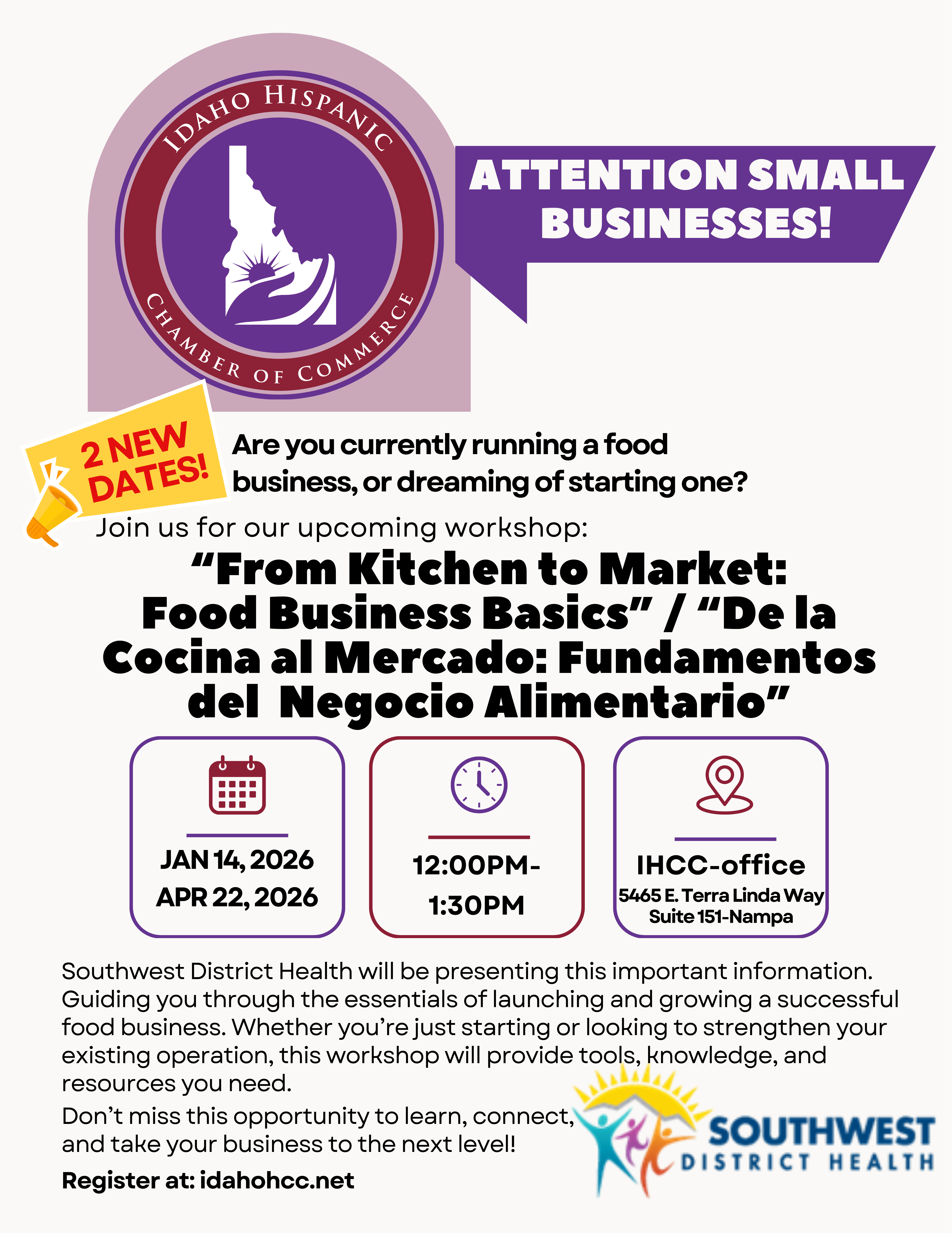 “From Kitchen to Market: Food Business Basics” / “De la Cocina al Mercado: Fundamentos del Negocio Alimentario.” 📅 Wednesday, Jan. 14th 🕔 12:00 PM – 1:30 PM (bring your questions to ask) 📍 Idaho Hispanic Chamber of Commerce
